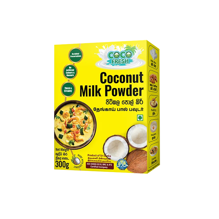 Discover the convenience of tropical goodness with COCOFRESH Coconut Milk Powder, a versatile and easy-to-use product crafted from the finest coconuts. This premium-quality powder delivers the rich, creamy flavor of fresh coconut milk in an instant, making it perfect for a variety of culinary applications. Whether you’re cooking up traditional dishes or exploring innovative recipes, COCOFRESH Coconut Milk Powder makes it easier to enjoy the creamy, tropical flavor of coconut milk anytime, anywhere! COCOFRESH Coconut milk powder is a white fine creamy powder made from coconut cream extracted from Sri Lankan coconut and spray dried to form water – soluble powder. It contains characteristic exotic flavor and aroma of fresh coconuts, and is free from odd flavors.