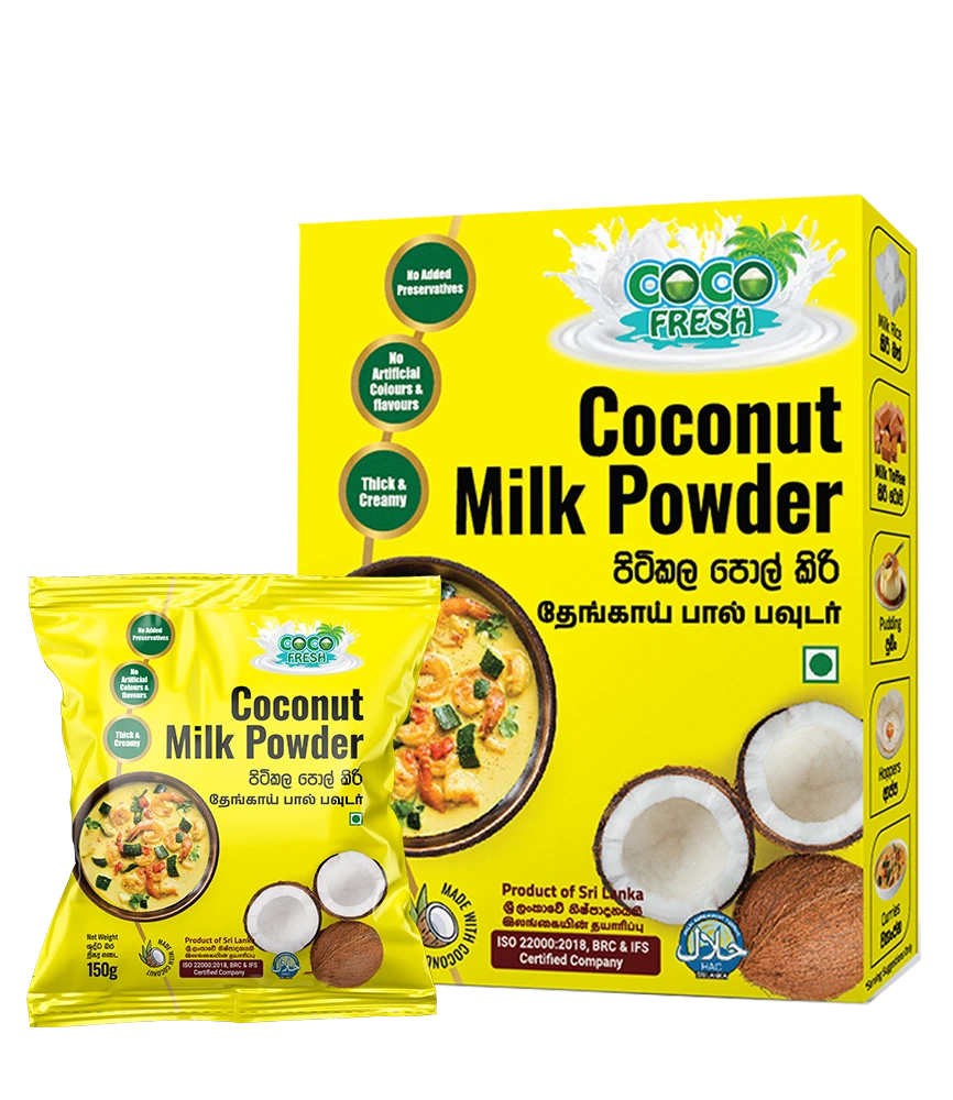 Discover the convenience of tropical goodness with COCOFRESH Coconut Milk Powder, a versatile and easy-to-use product crafted from the finest coconuts. This premium-quality powder delivers the rich, creamy flavor of fresh coconut milk in an instant, making it perfect for a variety of culinary applications. Whether you’re cooking up traditional dishes or exploring innovative recipes, COCOFRESH Coconut Milk Powder makes it easier to enjoy the creamy, tropical flavor of coconut milk anytime, anywhere! COCOFRESH Coconut milk powder is a white fine creamy powder made from coconut cream extracted from Sri Lankan coconut and spray dried to form water – soluble powder. It contains characteristic exotic flavor and aroma of fresh coconuts, and is free from odd flavors.