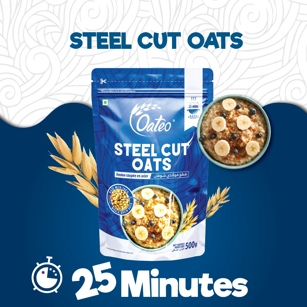 Delectably nutty and chewy, OATEO Steel Cut Oats are a nutritious choice for those seeking to improve their diet. Better known as the healthier form of oats that help regulate blood sugar levels in the body, Steel Cut Oats are produced by cutting the oat groat into 2 or 3 pieces with a steel blade.